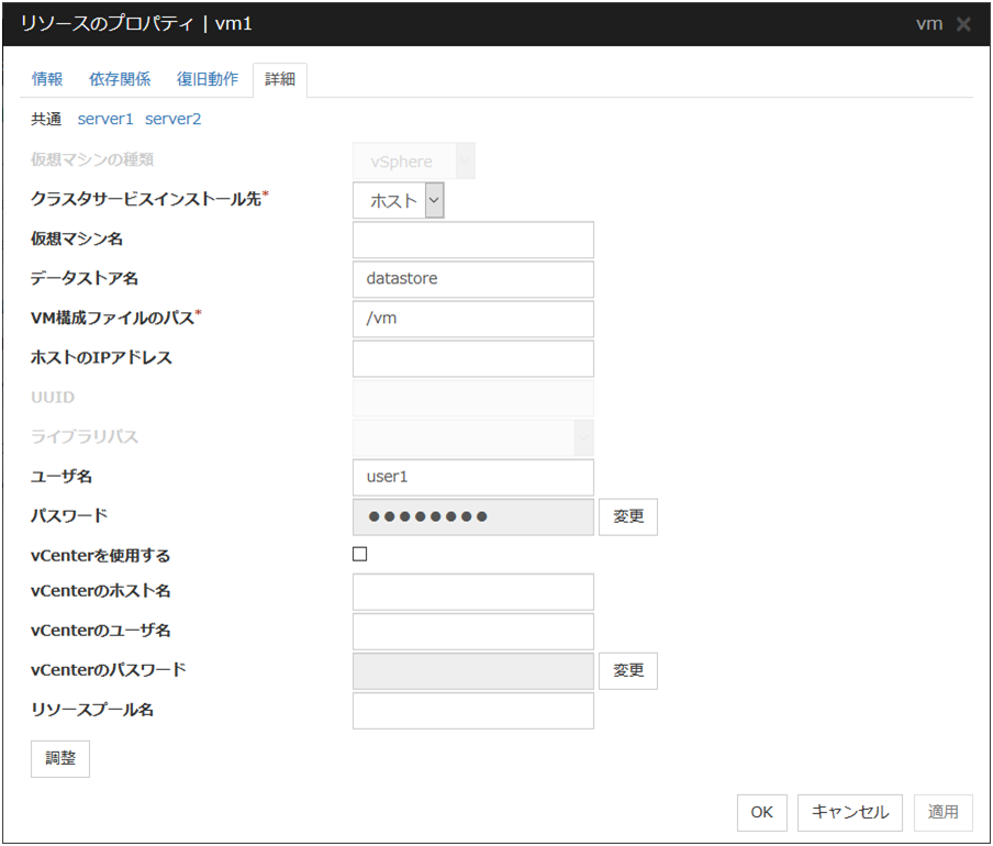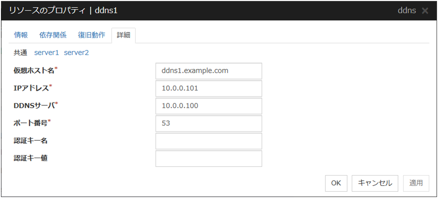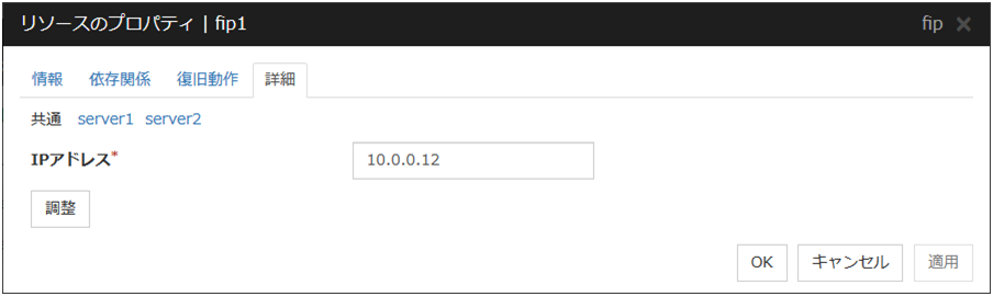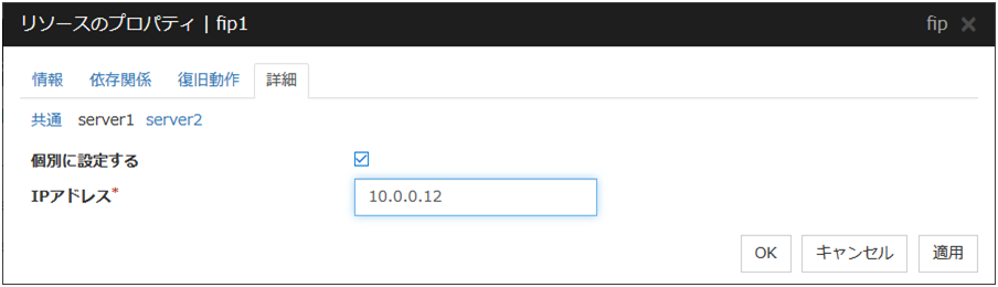 仮想ホスト名(DNS 名)に対応する IP アドレスを入力します(IPv4)。各サーバの IP アドレスを使用する場合、各サーバのタブで IP アドレスを入力します。サーバ別の設定を行う場合は[共通]タブでは、任意のサーバの IP アドレスを記載し、他のサーバは個別設定を行うようにしてください。