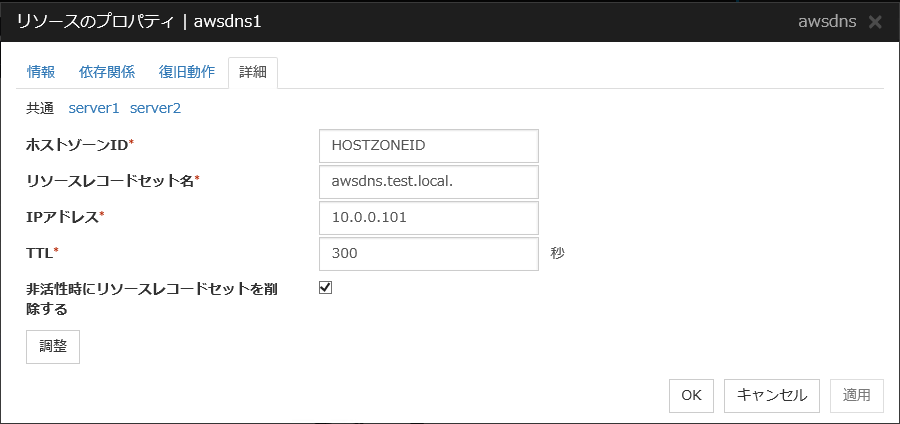 [AWS DNS リソース調整プロパティ] ダイアログボックスを表示します。AWS DNS リソースの詳細設定を行います。