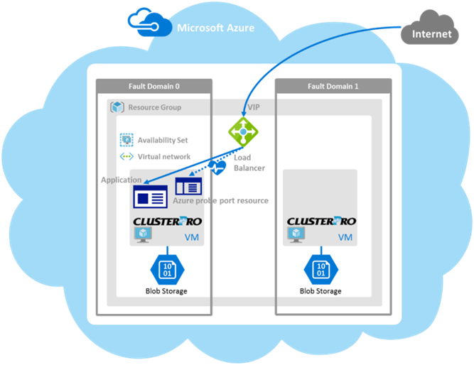 上記図の Microsoft Azure 環境上に構築したクラスタには、VIP というグローバルな IP アドレスと外部から通信するためのエンドポイント、または DNS 名と外部から通信するためのエンドポイントを指定してアクセスします。 クラスタの現用系と待機系は、CLUSTERPRO から Microsoft Azure のロードバランサ(上記図の Load Balancer)を制御して切り替えます。制御には、Health Check を利用します。