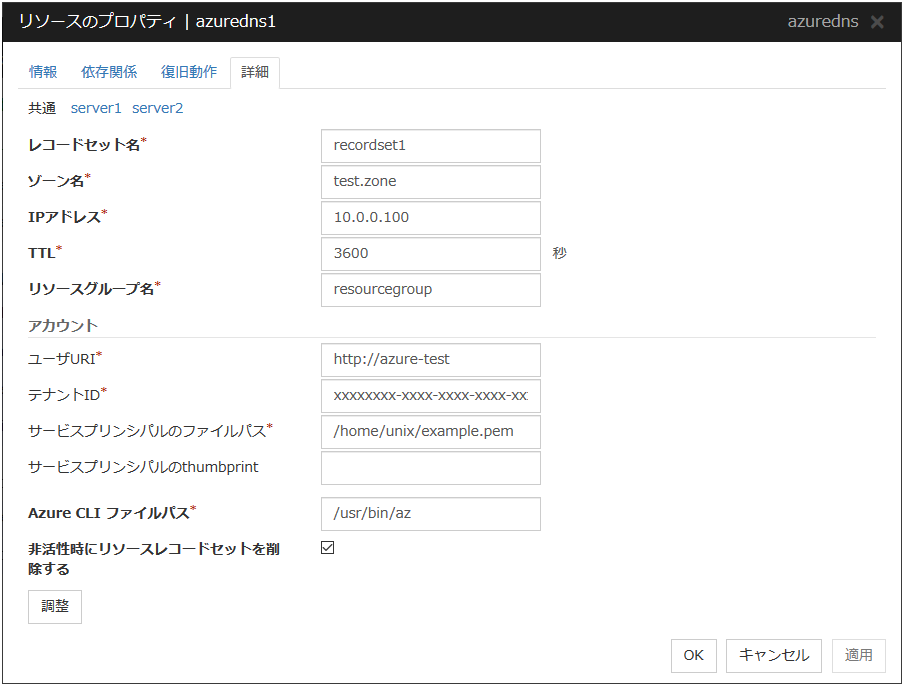 [Azure DNS リソース調整プロパティ] ダイアログボックスを表示します。Azure DNS リソースの詳細設定を行います。