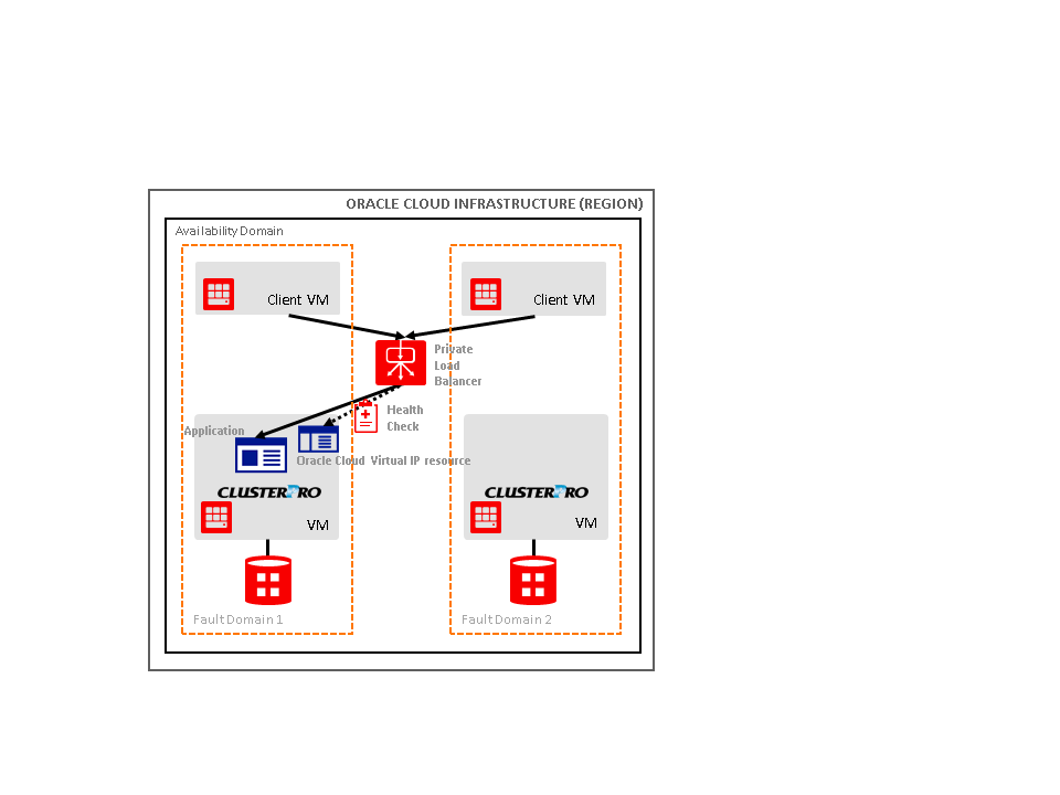 クライアントアプリケーションは、Oracle Cloud Infrastructure 環境の仮想マシンに対して、パブリック仮想 IP アドレス(以下、VIP と記載)を使用してクラスターを構成するノードに接続することができます。VIP アドレスを使用することにより、フェイルオーバーまたは、グループの移動が発生しても、クライアントは、仮想マシンの切り替えを意識する必要がありません。