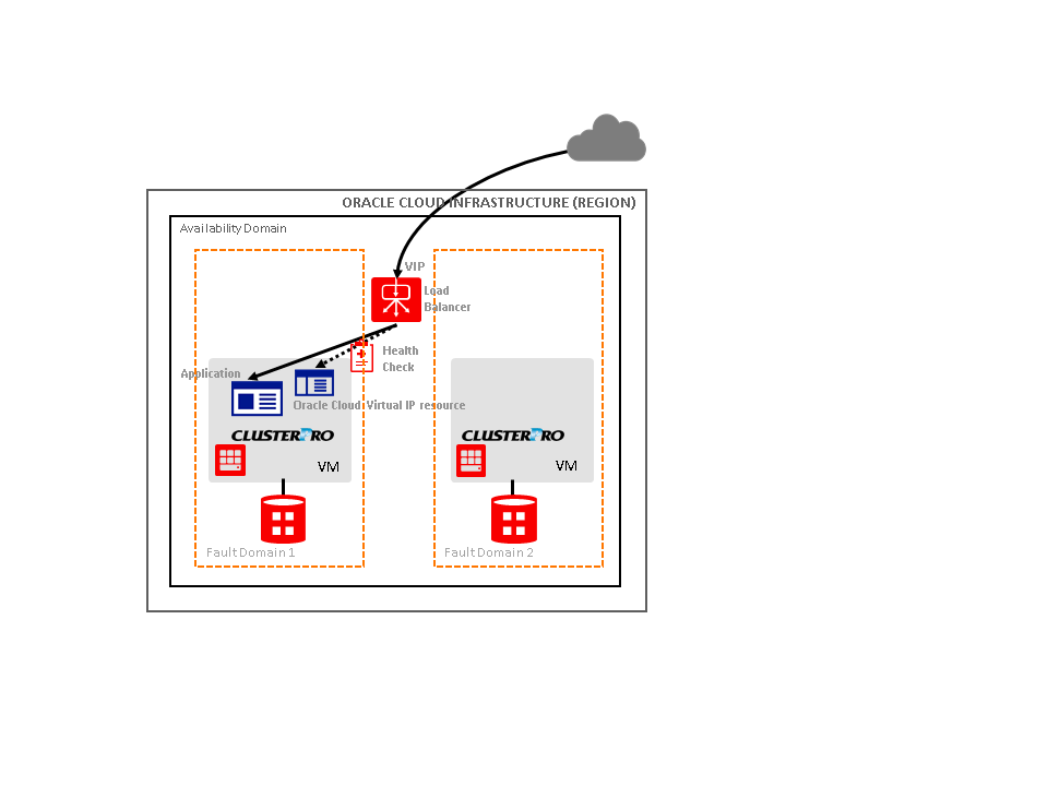上記図の Oracle Cloud Infrastructure 環境上に構築したクラスターには、VIP というグローバルな IP アドレスと外部から通信するためのポート、または DNS 名と外部から通信するためのポートを指定してアクセスします。 クラスターの現用系と待機系は、CLUSTERPRO から Oracle Cloud Infrastructure のロードバランサ(上記図の Load Balancer)を制御して切り替えます。制御には上記図の、Health Check を利用します。