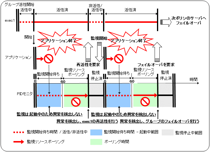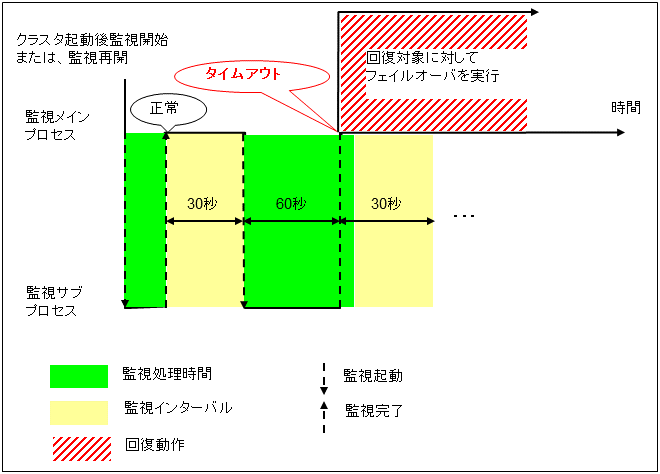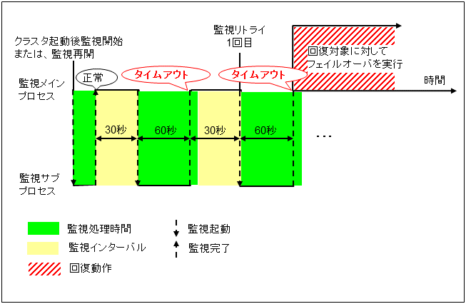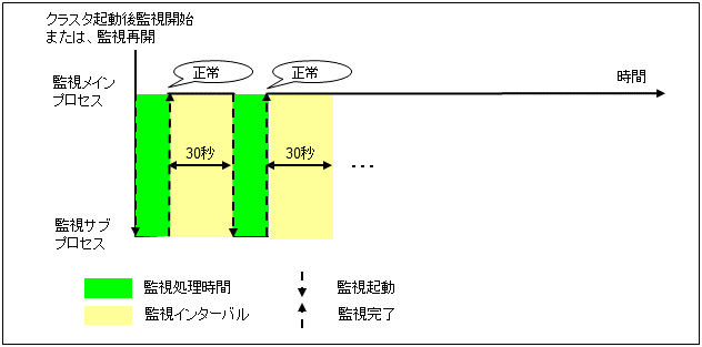 Google Cloud 仮想 IP モニタリソースは、Google Cloud 仮想 IP リソースが起動しているノードに対して、Google Cloud 仮想 IP リソース活性時に起動する制御プロセスの死活監視を行います。正常に起動していない場合は、監視異常となります。また、ヘルスチェック待ち受けのタイムアウトが発生した場合、[ヘルスチェックのタイムアウト時動作] の指定によっては監視異常となります。