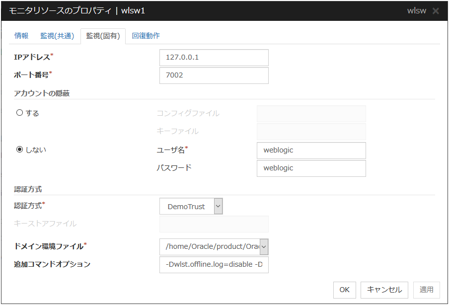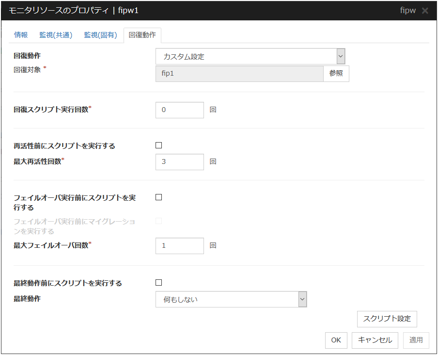 AWS CLIコマンドの失敗は監視対象が異常ではないため何もしない場合:[回復動作を実行しない(警告を表示しない)]を設定してください。この場合でも VIP の存在が確認できない場合や VPC のルーティングの健全性が確認できない場合の異常は検出可能です。そのため、この設定を推奨します。