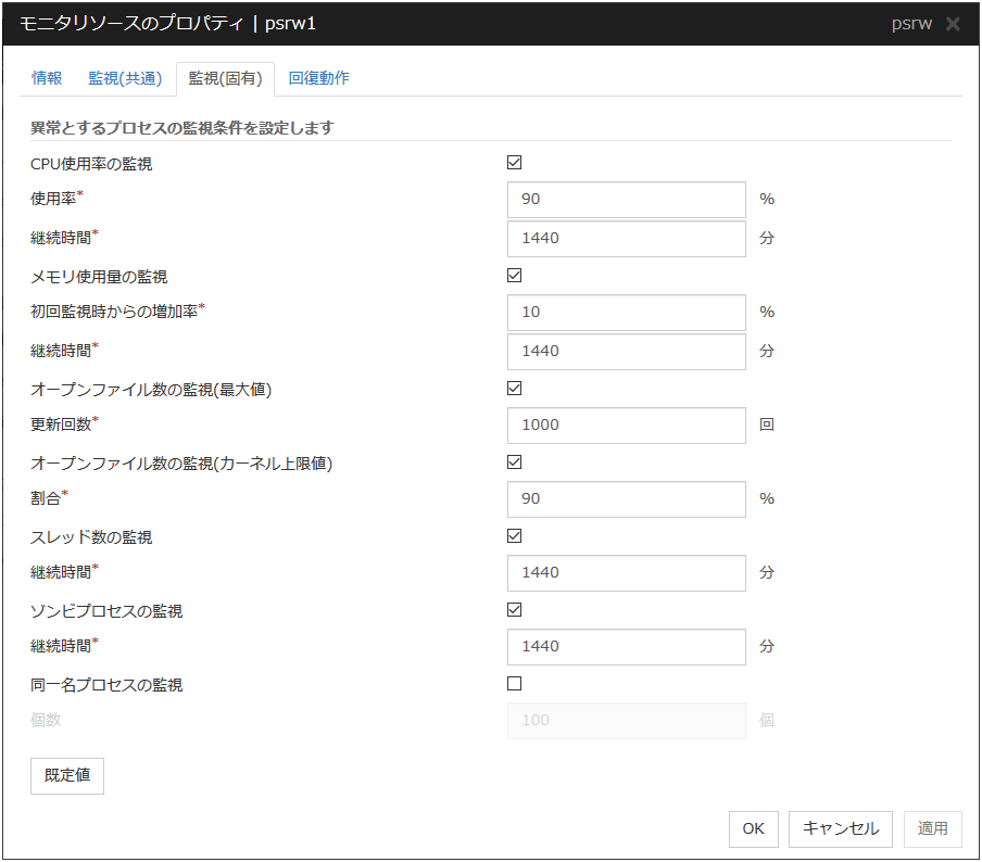 チェックボックスがオン同一名プロセスの監視を行います。 チェックボックスがオフ同一名プロセスの監視を行いません。