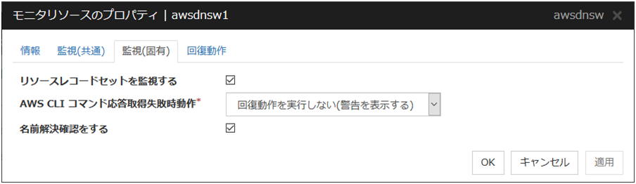 AWS CLIコマンドの失敗は監視対象が異常ではないため何もしない場合:[回復動作を実行しない(警告を表示しない)]を設定してください。この場合でも 登録した IP アドレスの健全性が確認できない場合の異常は検出可能です。そのため、この設定を推奨します。