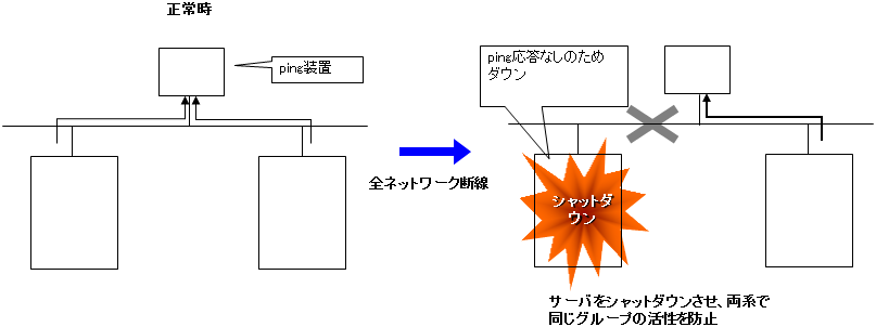 ping 用装置の障害などにより、ハートビートが途絶する前に全サーバで [ping] コマンドの応答が返らない状態が続くと、ネットワークパーティションの解決ができなくなりますので、この状態でハートビート切れを検出した場合、全サーバでネットワークパーティション発生時の動作を実施します。