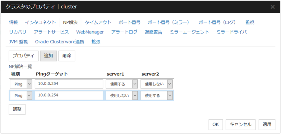 PING ネットワークパーティション解決リソースを使用するためには、以下の設定が必要です。