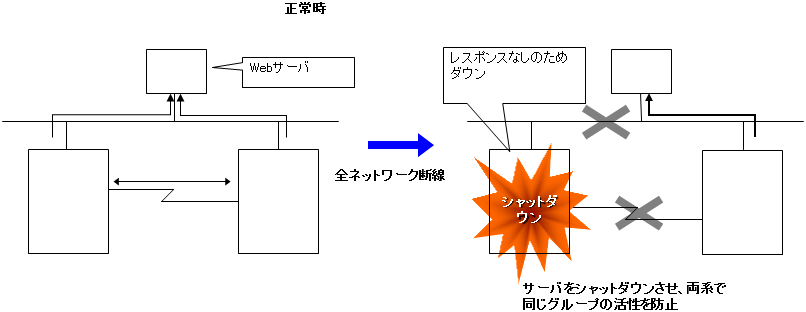 ネットワークパーティション解決を行わないため、クラスタサーバ間の全ネットワーク通信路に障害が発生した場合には、全サーバがフェイルオーバを実行します。