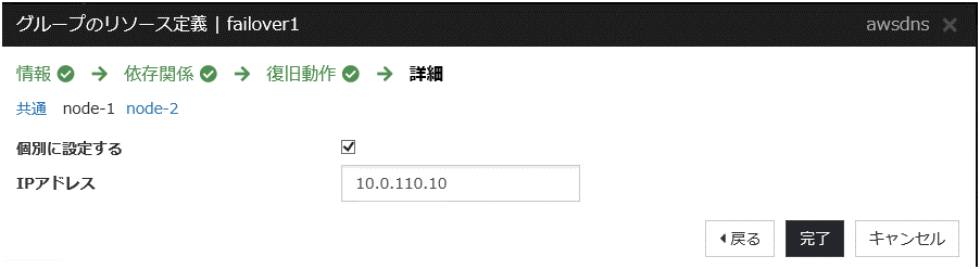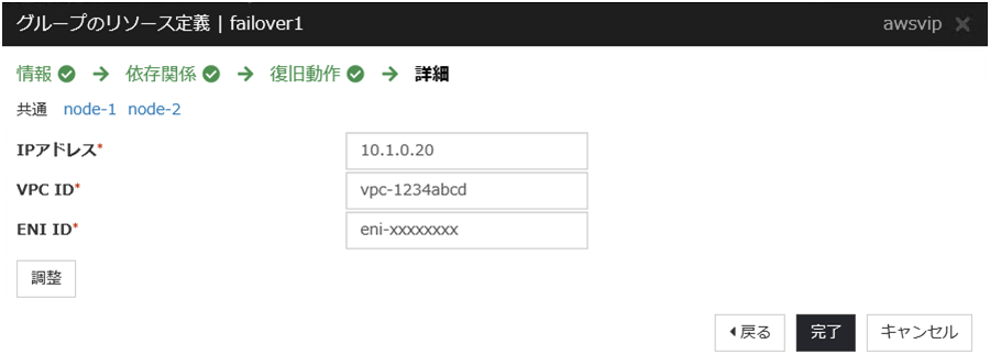 異常を検知した時点でAWS 仮想 IP リソースが自動的に再起動され、ターゲットが正しいENI IDに更新されます。別のENI IDに変更された原因として、他のHAクラスタで同じVIPアドレスを誤って使用していないかなどを確認します。