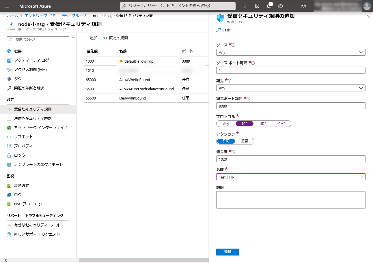 Microsoft Azure ポータル(https://portal.azure.com/)にログインし、以下の手順で受信セキュリティ規則の設定を行います。