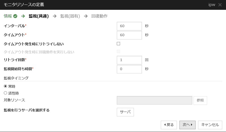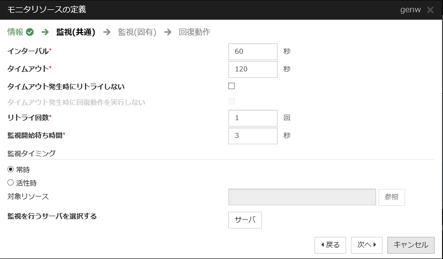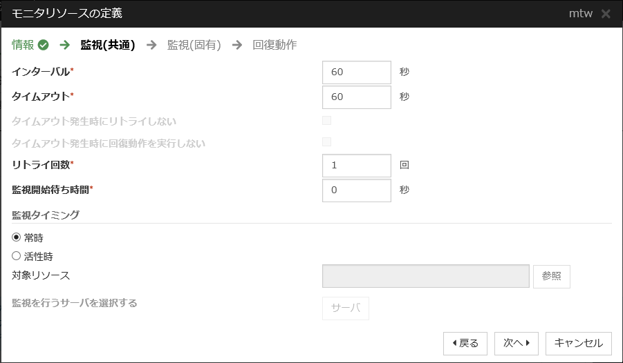 [監視(共通)] 画面が表示されます。[監視タイミング] が [常時] であることを確認します。[監視を行うサーバを選択する] で起動可能なサーバをひとつ選択し追加します。[OK] をクリックし、[次へ] をクリックします。[監視(固有)] 画面が表示されます。
