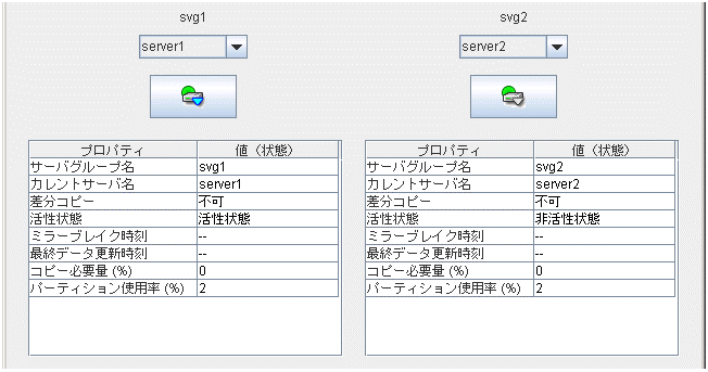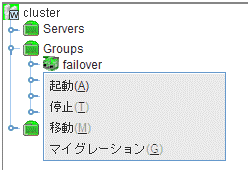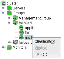 サーバ、グループリソース等の各クラスタ資源の状態が確認できます。詳しくは「 2.3. WebManager のツリービューで各オブジェクトの状態を確認するには 」を参照してください。