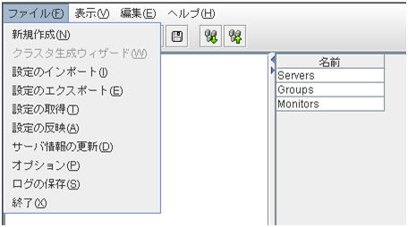 アラート検索を実行します。[ツール] メニューの [アラート検索] を 選択するのと同じです。 ログを採取します。[ツール] メニューの [クラスタログ採取] を選択するのと同じです。 リロードを実行します。[ツール] メニューの [リロード] を選択 するのと同じです。 オプションを表示します。[ツール] メニューの [オプション] を選択するのと同じです。 時刻情報を表示します。[ツール] メニューの [時刻情報] を選択するのと同じです。時刻情報が更新された場合、アイコンが変わります。時刻情報ダイアログを表示するとアイコンは元に戻ります。 統合マネージャを表示します。[ツール] メニューの [統合マネージャ] を選択するのと同じです。