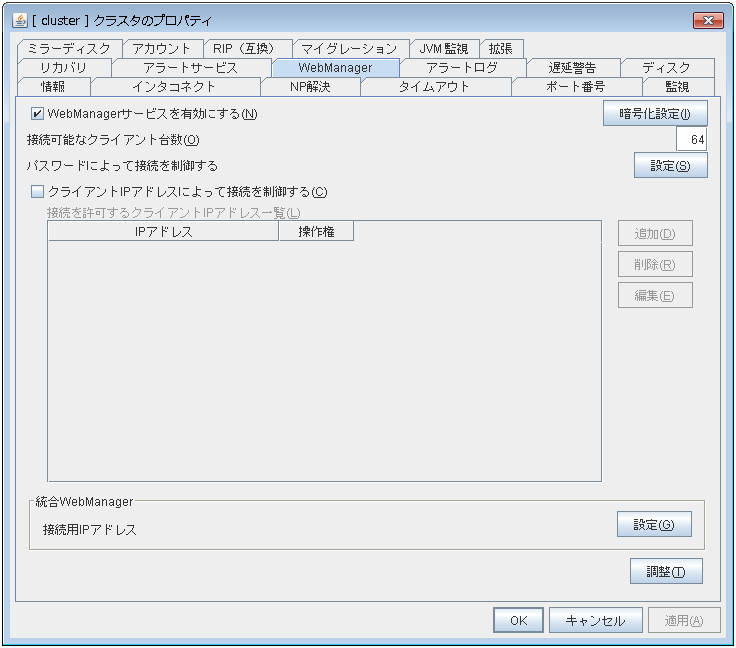 管理用 PC の Web ブラウザから接続する際の URL には、WebManager 接続用のフローティング IP アドレスまたは仮想 IP アドレスを指定します。これらのアドレスは管理グループのリソースとして登録されます。管理グループが存在しない場合、クラスタを構成するいずれかのサーバの実 IP アドレス (そのサーバに固定的に割り当てられたアドレス) を指定して接続することもできますが、この場合は接続先サーバがダウンしているとクラスタの状態を取得できなくなります。