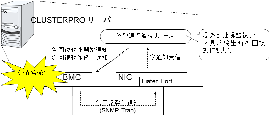 Express5800/A1080a,A1040a シリーズに搭載された BMC が異常を検出した場合に、即座に CLUSTERPRO で回復動作を実行するための機能です。