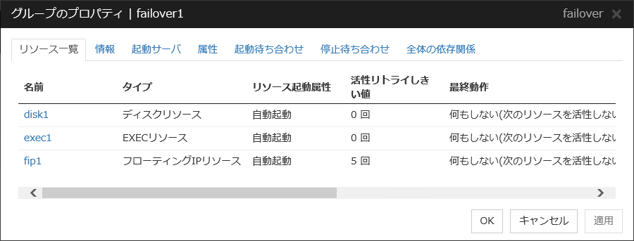 グループとはフェイルオーバを行う単位です。グループにはフェイルオーバ時の動作に関する規則 (フェイルオーバポリシー) が設定できます。
