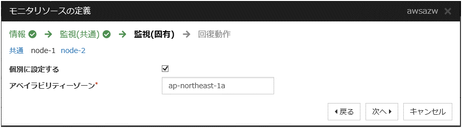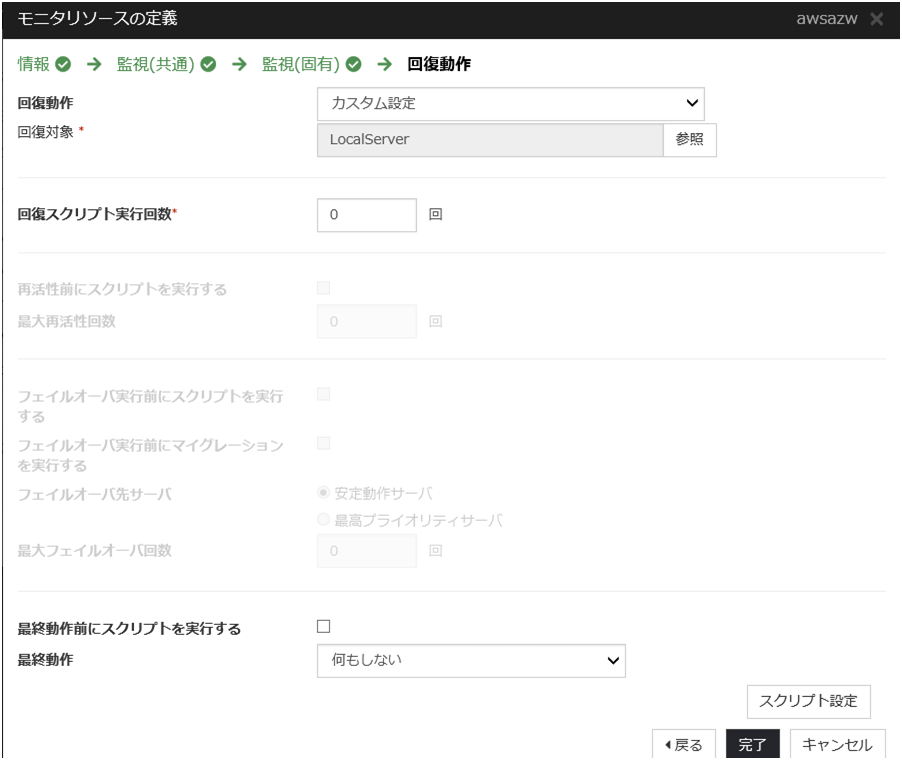 頻繁に警告が表示される場合は、「回復動作を実行しない(警告を表示しない)」へ変更することを推奨します。この場合でも、監視リソースから実行する AWS CLI の実行失敗や応答遅延以外のエラーは検知可能です。
