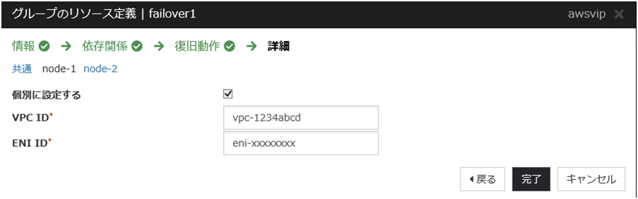 異常を検知した時点でAWS 仮想 IP リソースが自動的に再起動され、ターゲットが正しいENI IDに更新されます。別のENI IDに変更された原因として、他のHAクラスタで同じVIPアドレスを誤って使用していないかなどを確認します。