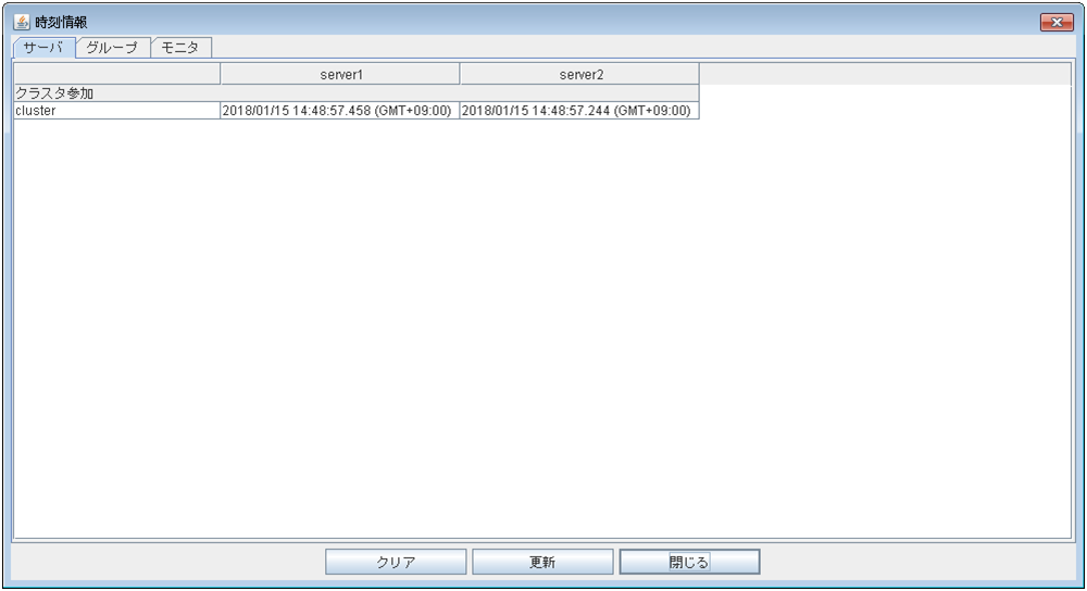 アラート検索を実行します。[ツール] メニューの [アラート検索] を 選択するのと同じです。 ログを採取します。[ツール] メニューの [クラスタログ採取] を選択するのと同じです。 リロードを実行します。[ツール] メニューの [リロード] を選択 するのと同じです。 オプションを表示します。[ツール] メニューの [オプション] を選択するのと同じです。 時刻情報を表示します。[ツール] メニューの [時刻情報] を選択するのと同じです。時刻情報が更新された場合、アイコンが変わります。時刻情報ダイアログを表示するとアイコンは元に戻ります。 統合マネージャを表示します。[ツール] メニューの [統合マネージャ] を選択するのと同じです。