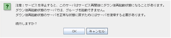 検証モード] を選択すると検証モードに切り替わります。ただし、操作制限するように登録されたクライアントから WebManager に接続した場合には、検証モードに切り替えることはできません。また、検証モードから、他のモードに切り替えると、「全てのモニタの擬似障害を停止しますか?」というダイアログが表示されます。「はい」を選択すると、擬似障害発生状態のモニタリソースが、全て通常の監視に戻ります。「いいえ」を選択すると、擬似障害発生状態のモニタリソースは、擬似障害発生状態を維持したまま他のモードに切り替わります。注釈