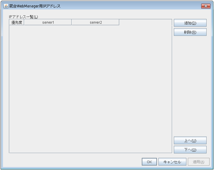 管理用 PC の Web ブラウザから接続する際の URL には、WebManager 接続用のフローティング IP アドレスまたは仮想 IP アドレスを指定します。これらのアドレスは管理グループのリソースとして登録されます。管理グループが存在しない場合、クラスタを構成するいずれかのサーバの実 IP アドレス (そのサーバに固定的に割り当てられたアドレス) を指定して接続することもできますが、この場合は接続先サーバがダウンしているとクラスタの状態を取得できなくなります。