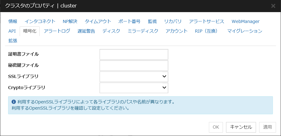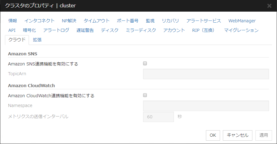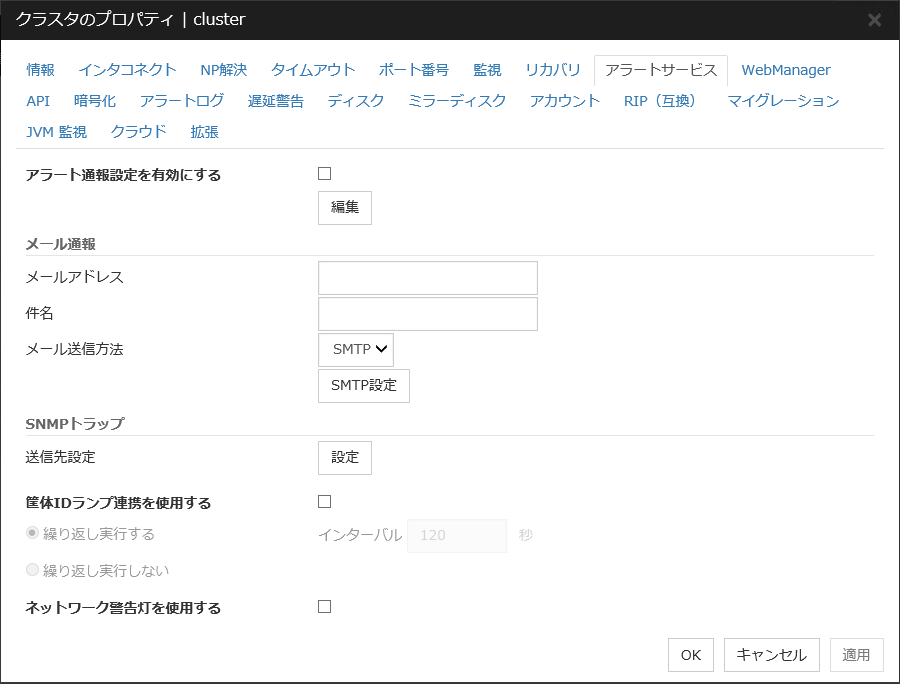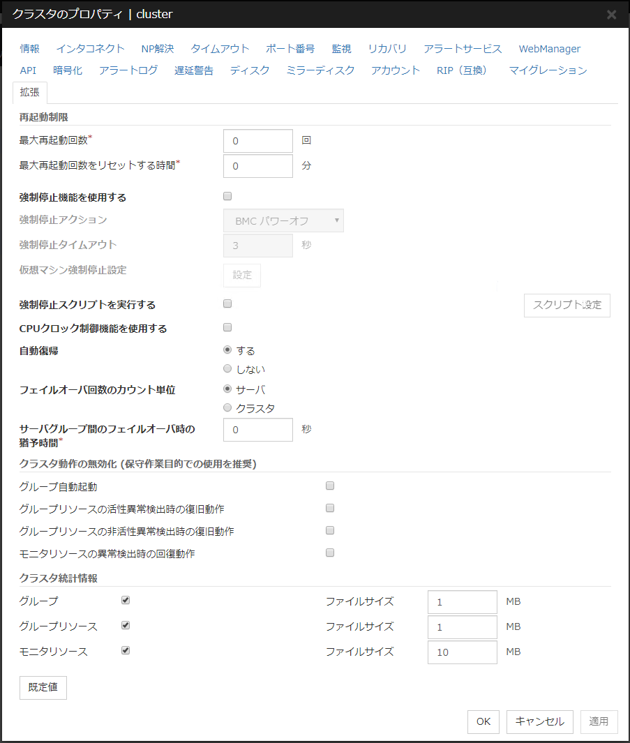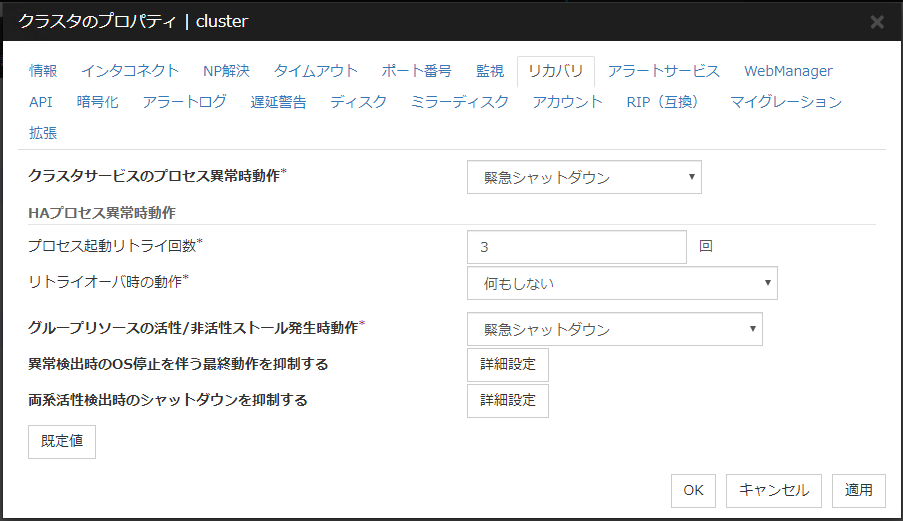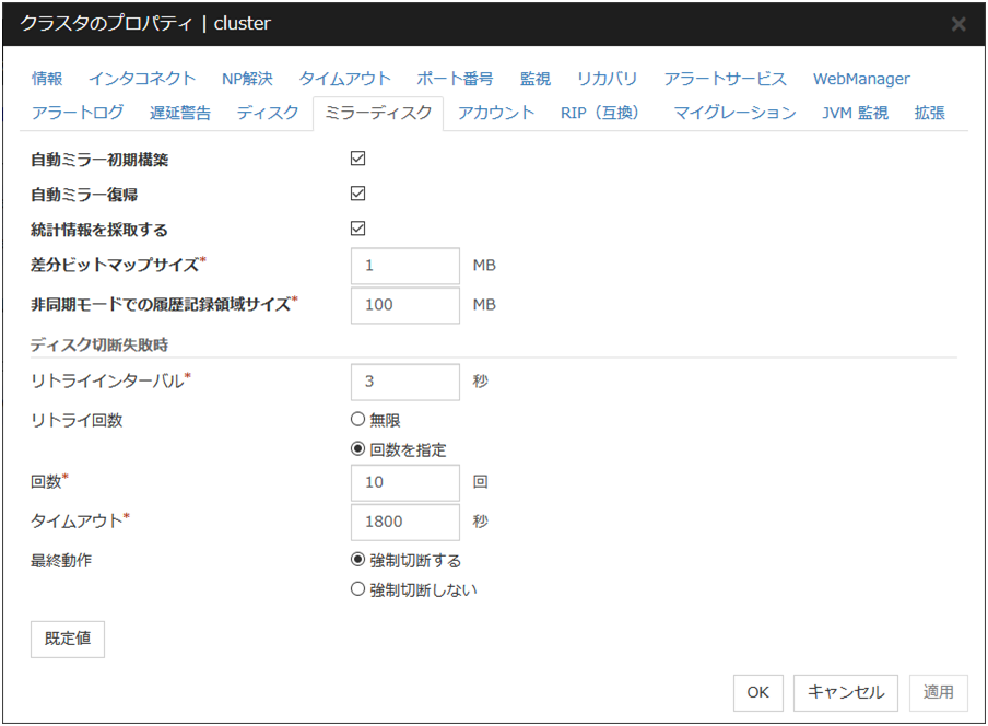 ミラーディスクリソース、ハイブリッドディスクリソースを使用している場合は、NP発生時動作にクラスタサービス停止を設定することは推奨されません。 クラスタサービス停止を設定した場合、ネットワークパーティション発生後の復旧時に、強制ミラー復帰が必要になる場合があります。