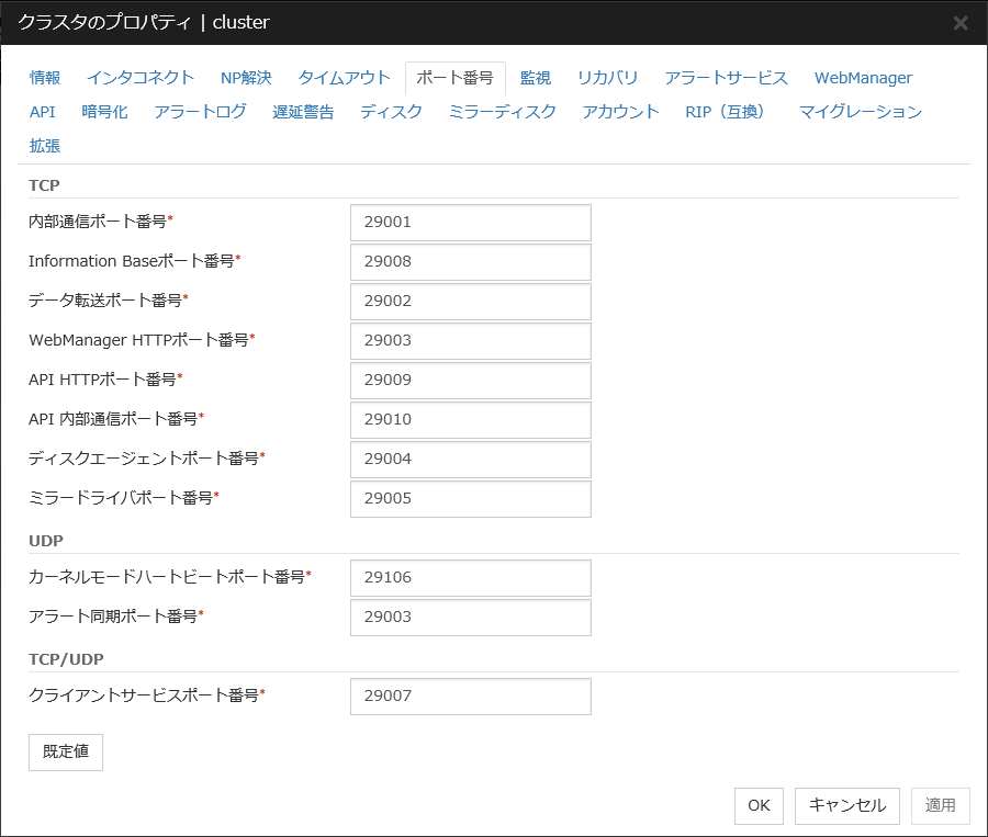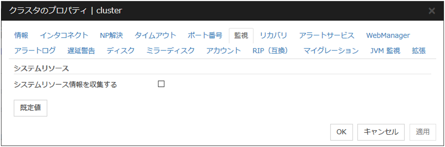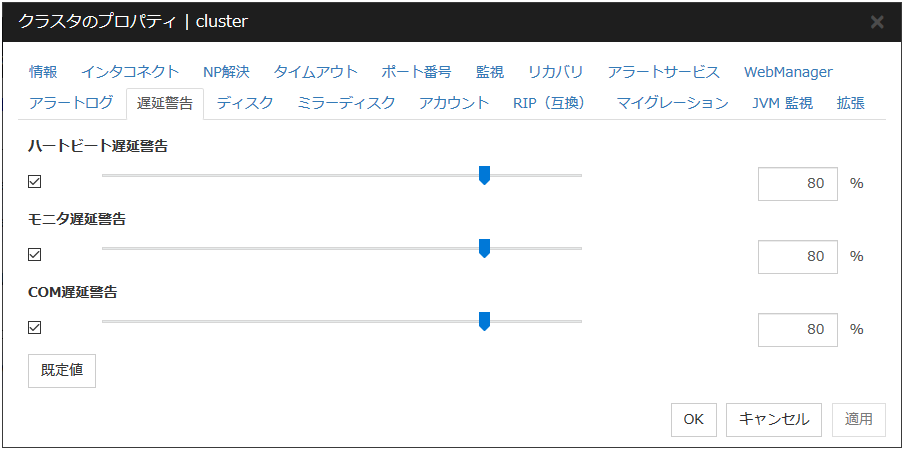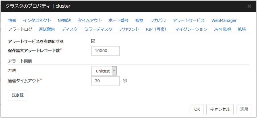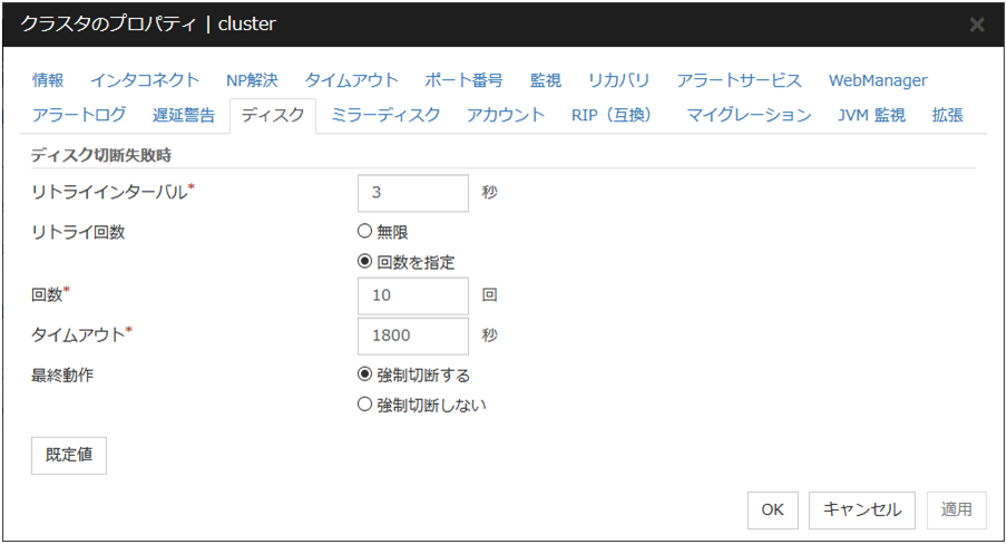 IO 待ち時間ディスク IO の待ち時間を設定します。使用する共有ディスク装置のディスク IO の最大遅延時間を上回るように設定します。ディスクパスを二重化している場合は、パス切替による IO 遅延も考慮する必要があります。 インターバルディスクハートビートのインターバルを設定します。 タイムアウトディスクハートビートのタイムアウト時間を設定します。 リトライ回数リトライ回数を設定します。 既定値IO 待ち時間、インターバル、タイムアウト、リトライ回数を既定値の設定に戻します。