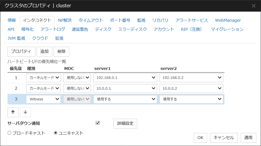 [優先度] はクラスタサーバ間の内部通信に使用する通信経路の優先順位を決定するために使用されます。クラスタサーバ間のハートビートは[優先度] に関わらず、ハートビート用に設定された全ての通信経路で実施されます。