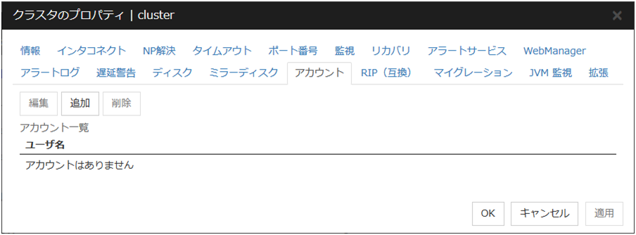 グループ一覧の追加Ping ターゲットの IP アドレスのグループを追加します。グループの最大登録数は 16 個です。1つのグループ内に複数のIPアドレスが登録されている場合、全てのIPアドレスからPingコマンドの応答が返らない状態が続くと、NP解決処理を行うことができません(Pingコマンドの応答が返るIPアドレスが1つでも存在する場合は、NP解決可能です)。また、複数のグループが登録されている場合、いずれか一つのグループからPingコマンドの応答が返らない状態が続くと、NP解決処理を行うことができません(全てのグループからPingコマンドの応答が返る場合は、NP解決可能です)。 グループ一覧の削除選択されているグループを削除します。 IP アドレス一覧の追加選択されているグループに IP アドレスを追加します。IP アドレスの最大登録数は 16 個です。1 個の Ping NP リソースに最大 256 個のIPアドレスが登録可能ですが、その中に 登録可能な IP アドレスは 16 種類までです。(同じ IP アドレスを複数利用してもかまいません) IP アドレス一覧の削除選択されている IP アドレスを一覧から削除します。 編集選択されている IP アドレスを編集します。 インターバルPing 送信のインターバルを設定します。 タイムアウトPing 応答待ちのタイムアウトを設定します。 リトライ回数リトライ回数を設定します。 既定値インターバル、タイムアウト、リトライ回数を既定値の設定に戻します。なお、インターバル、リトライ回数に指定する値は、以下の条件式を満たす必要があります。満たさない場合、NP解決処理を正常に行うことができません。条件式)ハートビートタイムアウト > (インターバル×リトライ回数)