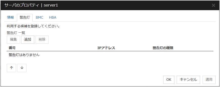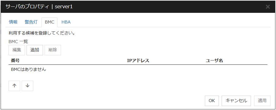 変更する場合に使用します。変更したい設定を選択して、[編集] をクリックしてください。 [BMCの入力] ダイアログボックスが表示されます。異機種のサーバでクラスタを構成する場合、BMC 機能が搭載されていないサーバがある場合には、BMC 機能が搭載されていないサーバの BMC タブは設定しないでください。このような構成の場合、筐体 ID ランプ連携、強制停止機能が動作すると BMC のアクションに失敗した旨のアラートが表示されます。