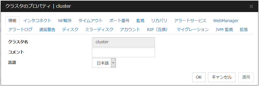 クラスタのプロパティでは、クラスタの詳細情報の表示や設定変更ができます。