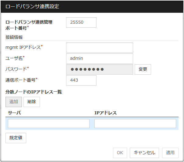 インターバル (1~99)ハートビートの間隔です。 タイムアウト (2~9999)ハートビートタイムアウトです。ここで設定された時間の間無応答が続くとサーバダウンとみなします。インターバルより大きい値である必要があります。