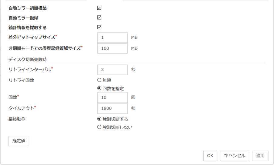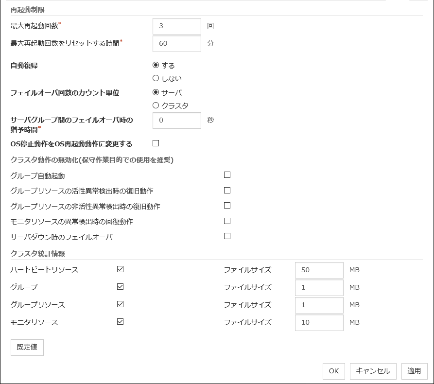 IO 待ち時間ディスク IO の待ち時間を設定します。使用する共有ディスク装置のディスク IO の最大遅延時間を上回るように設定します。ディスクパスを二重化している場合は、パス切替による IO 遅延も考慮する必要があります。 インターバルディスクハートビートのインターバルを設定します。 タイムアウトディスクハートビートのタイムアウト時間を設定します。 リトライ回数リトライ回数を設定します。 既定値IO 待ち時間、インターバル、タイムアウト、リトライ回数を既定値の設定に戻します。