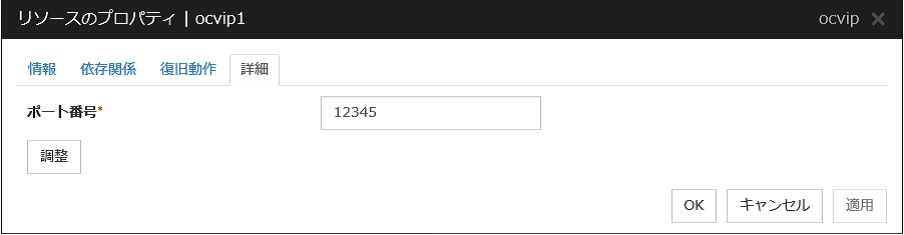 [Oracle Cloud 仮想 IP リソース調整プロパティ] ダイアログボックスを表示します。Oracle Cloud 仮想 IP リソースの詳細設定を行います。