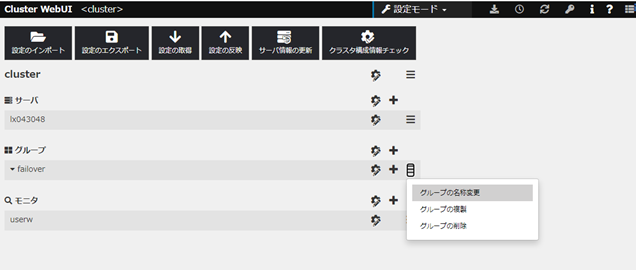 グループとはフェイルオーバを行う単位です。グループにはフェイルオーバ時の動作に関する規則 (フェイルオーバポリシー) が設定できます。