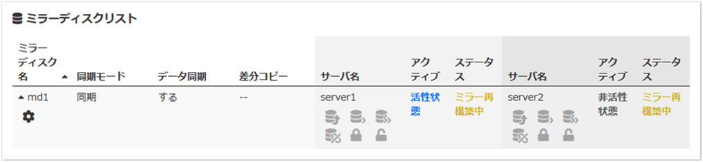 - 該当グループが起動(活性)後、自動ミラー復帰が始まります。差分ミラー復帰が可能な場合には差分ミラー復帰が行われます。差分ミラー復帰が不可能な場合には全面コピーが行われます。自動ミラー復帰をONに設定していない等、自動ミラー復帰が開始されない場合には、ミラーディスクリストを使って手動でミラー復帰を開始してください。