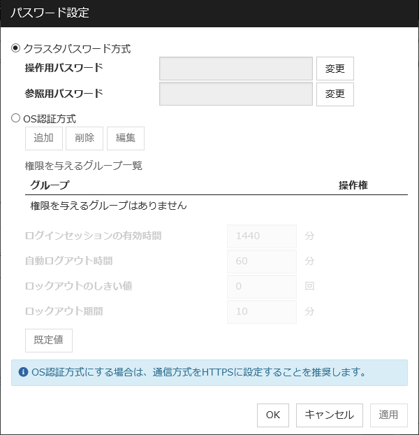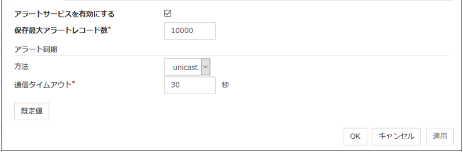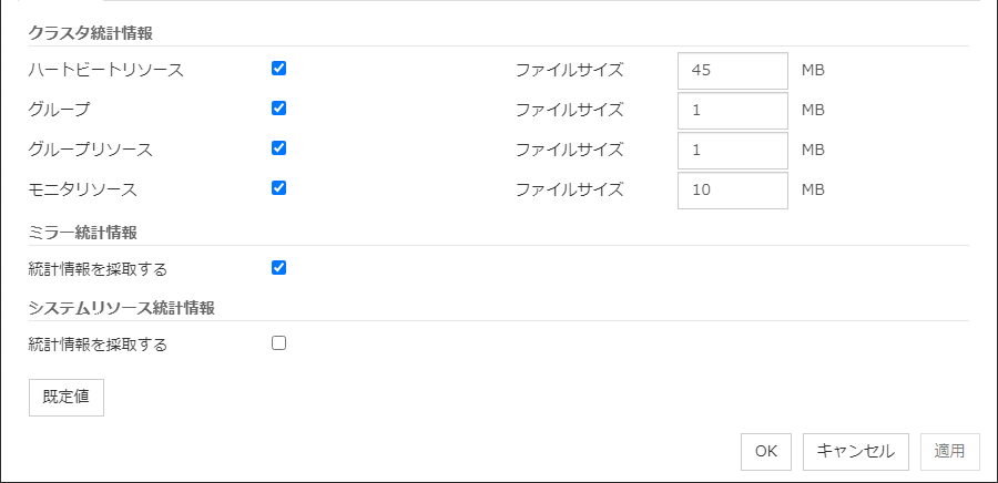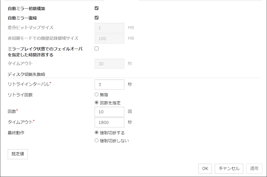 IO 待ち時間ディスク IO の待ち時間を設定します。使用する共有ディスク装置のディスク IO の最大遅延時間を上回るように設定します。ディスクパスを二重化している場合は、パス切替による IO 遅延も考慮する必要があります。 インターバルディスクハートビートのインターバルを設定します。 タイムアウトディスクハートビートのタイムアウト時間を設定します。 リトライ回数リトライ回数を設定します。 既定値IO 待ち時間、インターバル、タイムアウト、リトライ回数を既定値の設定に戻します。