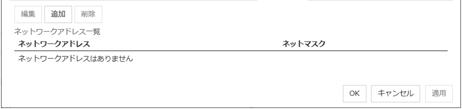 グループ一覧の削除選択されているグループを削除します。 IP アドレス一覧の追加選択されているグループに IP アドレスを追加します。IP アドレスの最大登録数は 16 個です。1 個の Ping NP リソースに最大 256 個のIPアドレスが登録可能ですが、その中に 登録可能な IP アドレスは 16 種類までです。(同じ IP アドレスを複数利用してもかまいません) IP アドレス一覧の削除選択されている IP アドレスを一覧から削除します。 編集選択されている IP アドレスを編集します。 インターバルPing 送信のインターバルを設定します。 タイムアウトPing 応答待ちのタイムアウトを設定します。 リトライ回数リトライ回数を設定します。 既定値インターバル、タイムアウト、リトライ回数を既定値の設定に戻します。なお、インターバル、リトライ回数に指定する値は、以下の条件式を満たす必要があります。満たさない場合、NP解決処理を正常に行うことができません。条件式)ハートビートタイムアウト > (インターバル×リトライ回数)