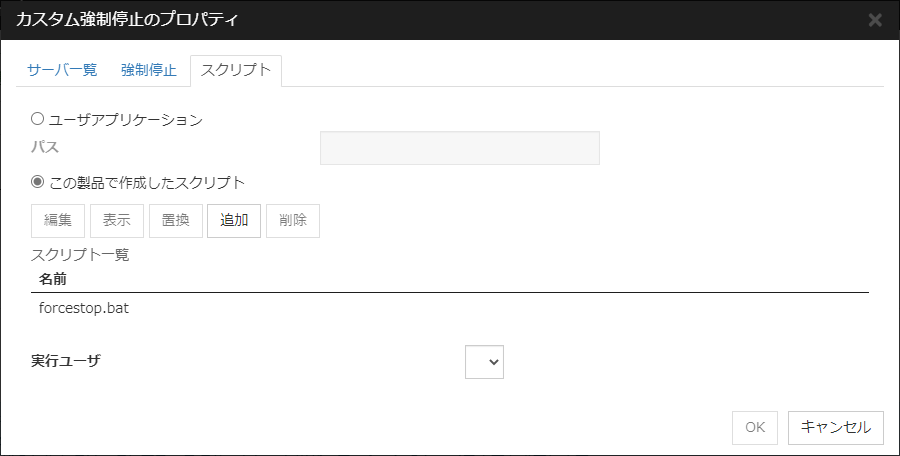 チェックボックスがオンサーバ停止時に音声ファイルを再生します。音声ファイルは手動で停止するまで連続で再生されます。 チェックボックスがオフサーバ停止時に音声ファイルを再生しません。