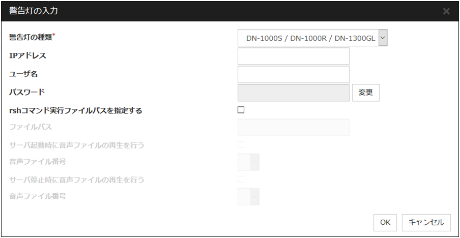 音声ファイル再生の設定は、警告灯の種類で DN-1500GL, NH-FV1 を選択した場合に有効になります。音声ファイル再生の設定後に警告灯の種類を DN1500GL, NH-FV1 以外に変更した場合、音声ファイル再生の設定は無効となります。