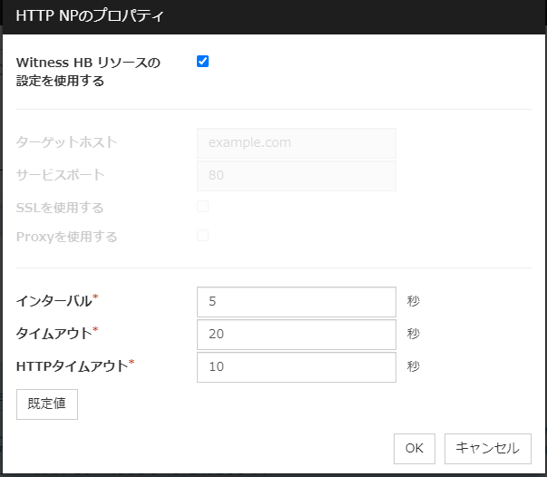 Witness HB の設定を使用する設定済みのWitness HBと同じターゲットホスト、サービスポートを使用します。 ターゲットホスト接続先のWebサーバのホストアドレスを設定します。 サービスポート接続先のWebサーバのポート番号を設定します。 SSLを使用するWebサーバとの通信にSSLを使用するか設定します。チェックボックスがオンの場合はSSLを使用し、オフの場合はSSLを使用しません。 Proxyを使用するWebサーバとの通信にProxyを使用するか設定します。チェックボックスがオンの場合、サーバプロパティのProxyタブの設定が有効になります。オフの場合はサーバプロパティの設定に関わらずProxyを使用しません。 インターバルHTTP リクエスト送信のインターバルを設定します。 タイムアウトHTTP レスポンス受信から次の HTTP レスポンス受信までのタイムアウトを設定します。 HTTPタイムアウトHTTP リクエスト送信から HTTP レスポンス受信までのタイムアウトを設定します。 既定値HTTP NP のプロパティの設定を既定値に戻します。