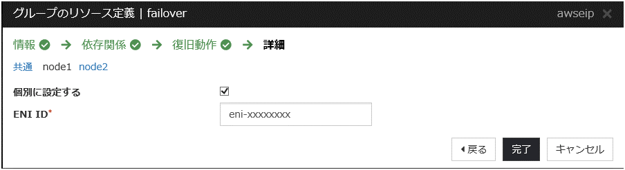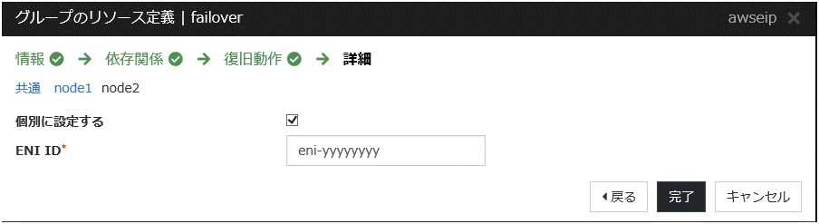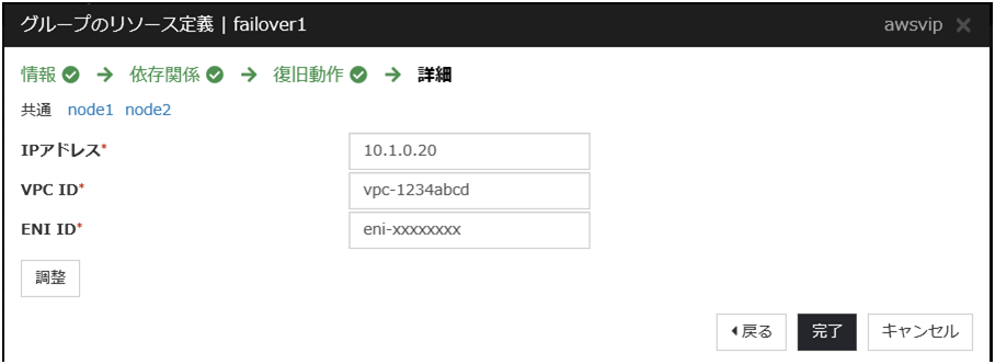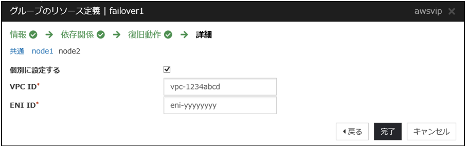 異常を検知した時点でAWS 仮想 IP リソースが自動的に再起動され、ターゲットが正しいENI IDに更新されます。別のENI IDに変更された原因として、他のHAクラスタで同じVIPアドレスを誤って使用していないかなどを確認します。