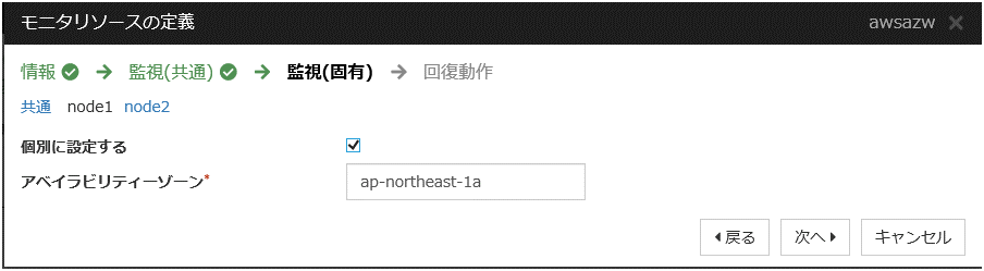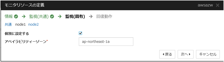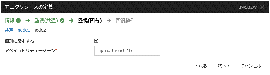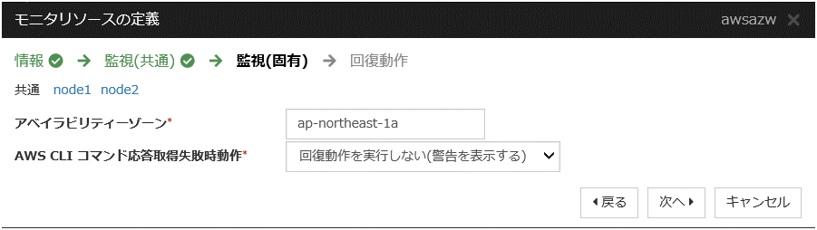 頻繁に警告が表示される場合は、「回復動作を実行しない(警告を表示しない)」へ変更することを推奨します。この場合でも、モニタリソースから実行する AWS CLI の実行失敗や応答遅延以外のエラーは検知可能です。