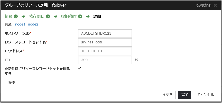 フェイルオーバー時にAWS DNSリソースによるリソースレコードセットの削除と作成に時間が掛かっている。[非活性時にリソースレコードセットを削除する] がチェックがONの場合、フェイルオーバー元でAWS DNSリソース非活性時にリソースレコードセットを削除後、フェイルオーバー先でAWS DNSリソース活性時にリソースレコードセットを作成となるため、名前解決可能になるまでの時間が遅くなる可能性があります。チェックがOFFの場合、非活性時にもリソースレコードセットが削除されなくなり、該当リソースレコードセットのIPアドレス更新のみとなるため、名前解決可能になるまでの時間が短縮される可能性があります。チェックをOFFにした場合は、通常のAWS DNSリソース非活性時やクラスタ停止後にもリソースレコードセットは削除されずに残りますので、ご留意ください。AWS DNSリソース非活性後やクラスタ停止後でも名前解決されます。AWS DNSリソースの[TTL]の値が大きい。
