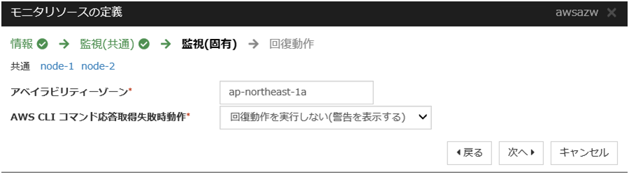 頻繁に警告が表示される場合は、「回復動作を実行しない(警告を表示しない)」へ変更することを推奨します。この場合でも、監視リソースから実行する AWS CLI の実行失敗や応答遅延以外のエラーは検知可能です。