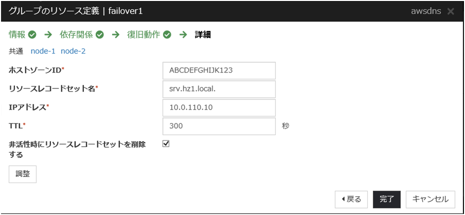 フェイルオーバー時にAWS DNSリソースによるリソースレコードセットの削除と作成に時間が掛かっている。[非活性時にリソースレコードセットを削除する] がチェックがONの場合、フェイルオーバー元でAWS DNSリソース非活性時にリソースレコードセットを削除後、フェイルオーバー先でAWS DNSリソース活性時にリソースレコードセットを作成となるため、名前解決可能になるまでの時間が遅くなる可能性があります。チェックがOFFの場合、非活性時にもリソースレコードセットが削除されなくなり、該当リソースレコードセットのIPアドレス更新のみとなるため、名前解決可能になるまでの時間が短縮される可能性があります。チェックをOFFにした場合は、通常のAWS DNSリソース非活性時やクラスタ停止後にもリソースレコードセットは削除されずに残りますので、ご留意ください。AWS DNSリソース非活性後やクラスタ停止後でも名前解決されます。AWS DNSリソースの[TTL]の値が大きい。