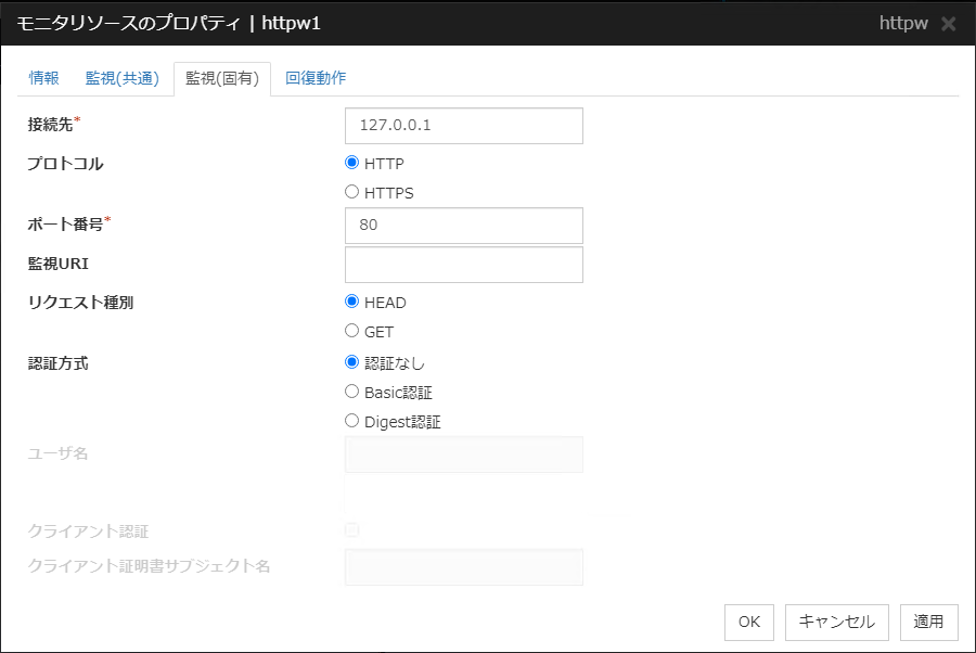 チェックボックスがオン(既定)登録した IP アドレスが仮想ホスト名(DNS 名)の名前解決によって得られるかを確認します。 チェックボックスがオフ監視しません。