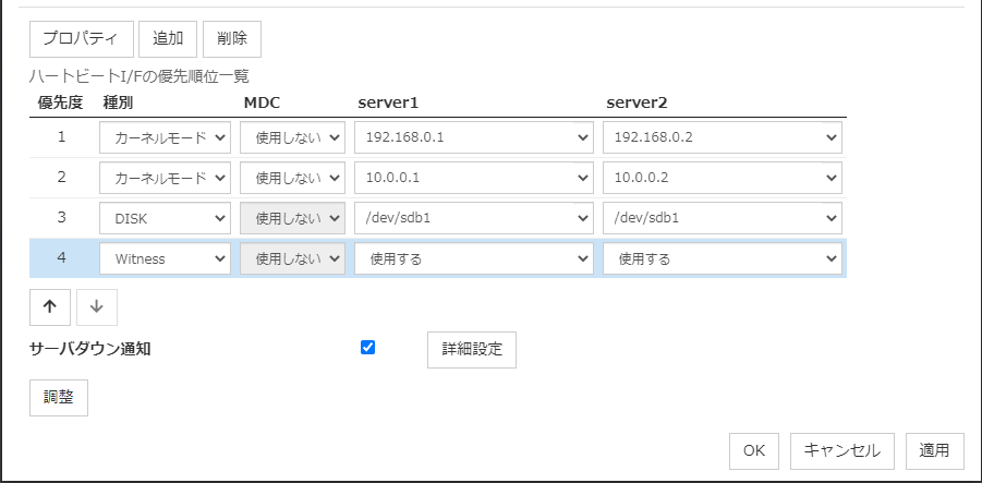 サーバダウン通知のチェックボックスがオンの場合にのみ有効な設定です。カーネルモードLANハートビートリソースを設定している場合のみ有効な設定です。内部バージョン 4.3.0-1 以降で新規に対応したカーネル使用時のみ有効な設定です。