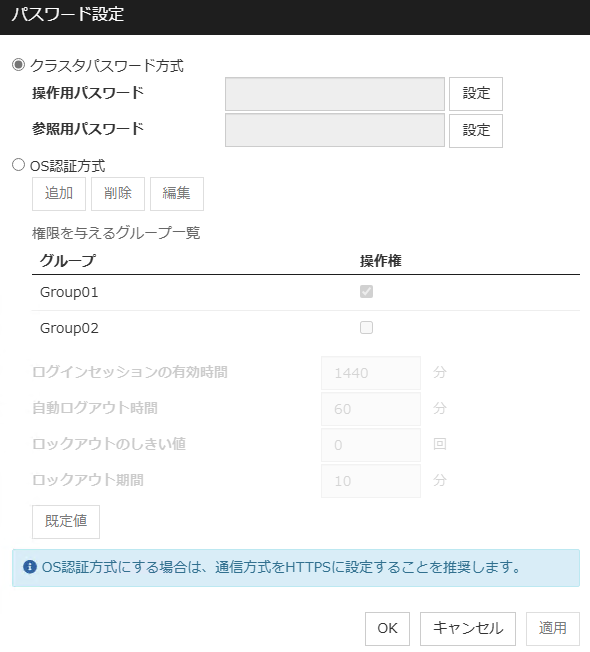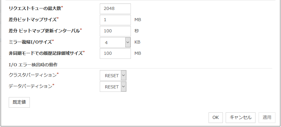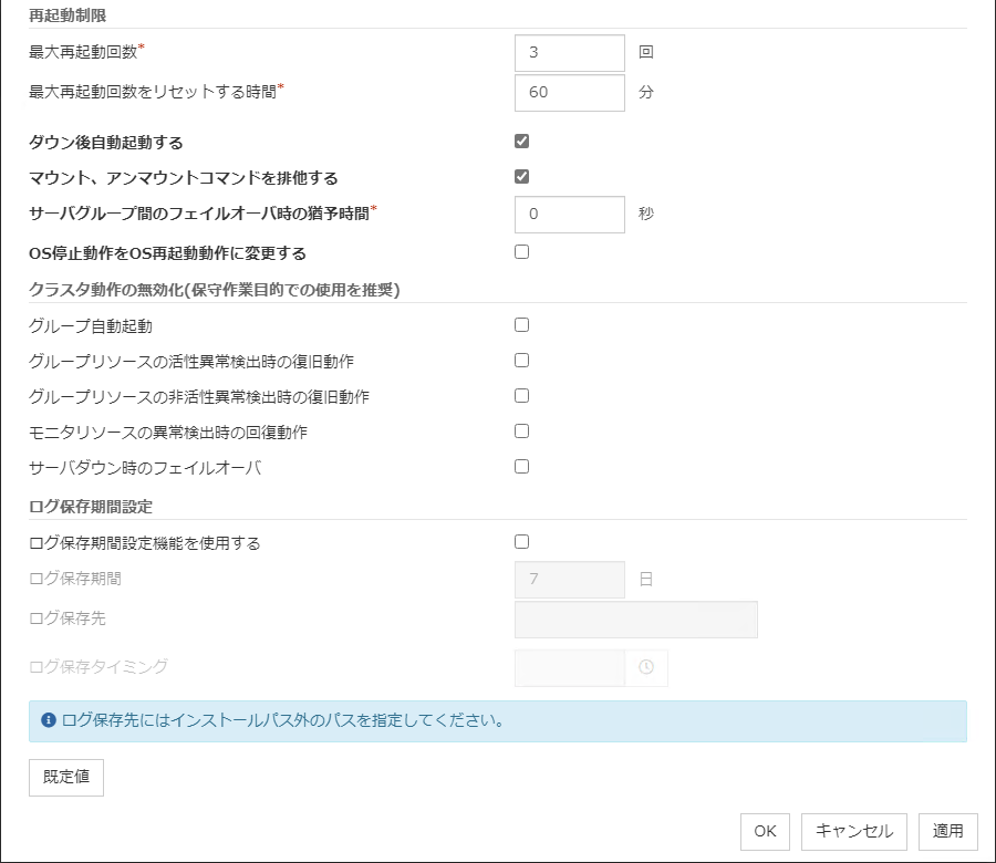 Cluster WebUI で設定可能なパラメータと既定値を以下の表に示します。パラメータを変更した場合のサーバへの反映方法を [1] - [12] で表し、該当欄に "O" を示します。
